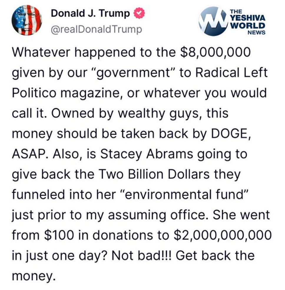 Trump Calls On DOGE To Reclaim Federal Funds From Politico, Stacey Abrams