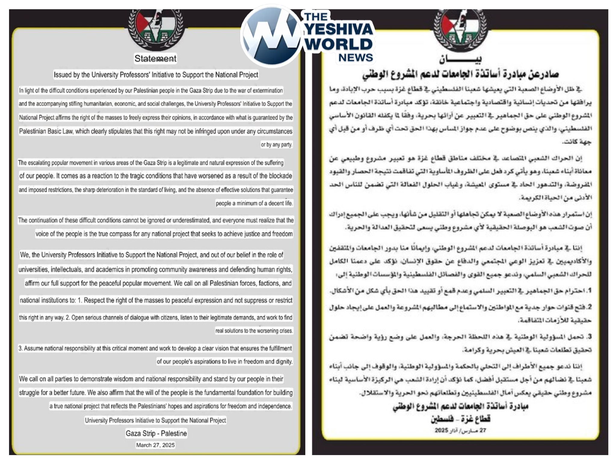 Professors in Gaza released a statement backing the ongoing Hamas protests and supporting the people’s right to free expression.