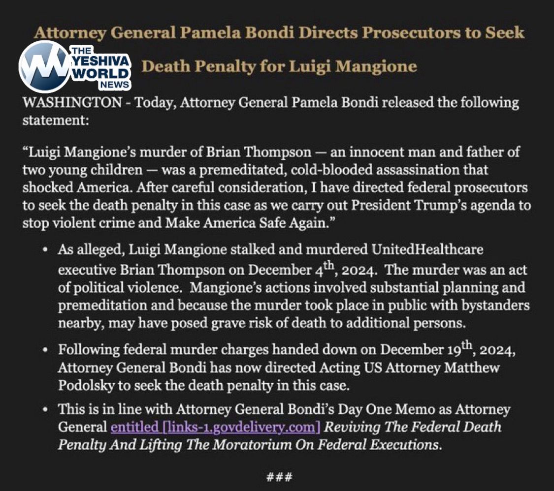 BREAKING: DOJ to seek death penalty for Luigi Mangione in UnitedHealthCare CEO murder case, Pam Bondi says.