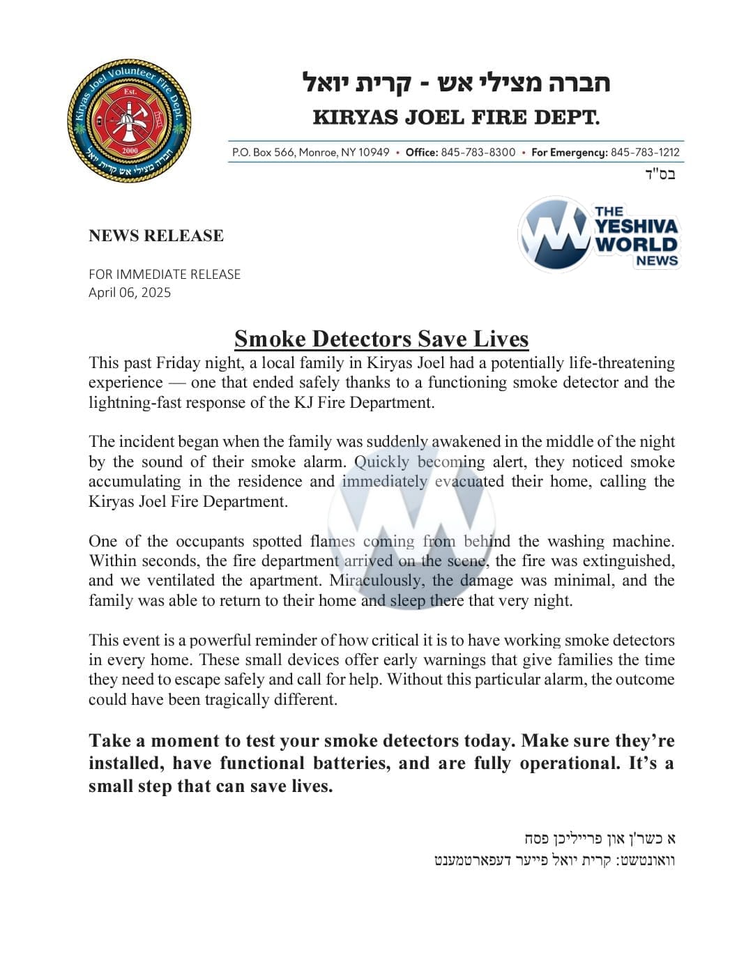 🚨 KIRYAS JOEL: This past Friday night, a local family in Kiryas Joel had a potentially life-threatening experience — one that ended safely thanks to a functioning smoke detector and the lightning-fast response of the KJ Fire Department.