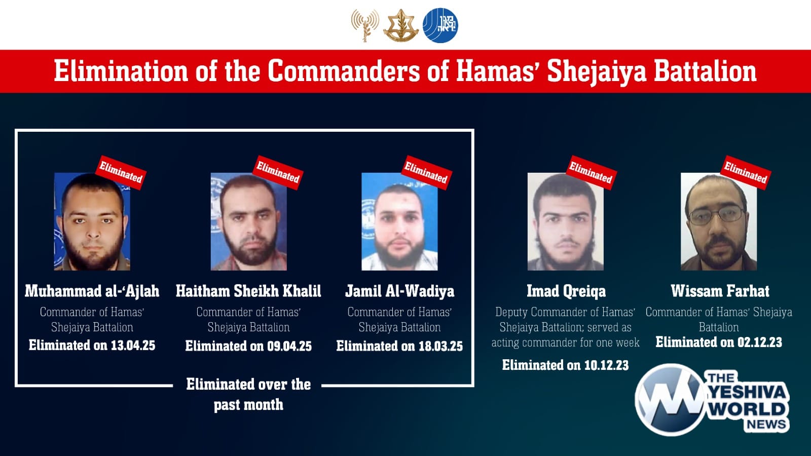 The IDF and Shin Bet announce that an airstrike in Gaza killed the latest commander of Hamas’s Shejaiya Battalion. Muhammad al-Ajlah is now the fifth commander of the Shejaiya Battalion to be killed by the IDF amid the war.