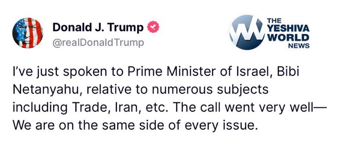 Presidents Trump says he just spoke to Prime Minister Netanyahu on subjects in the call went “very well”.