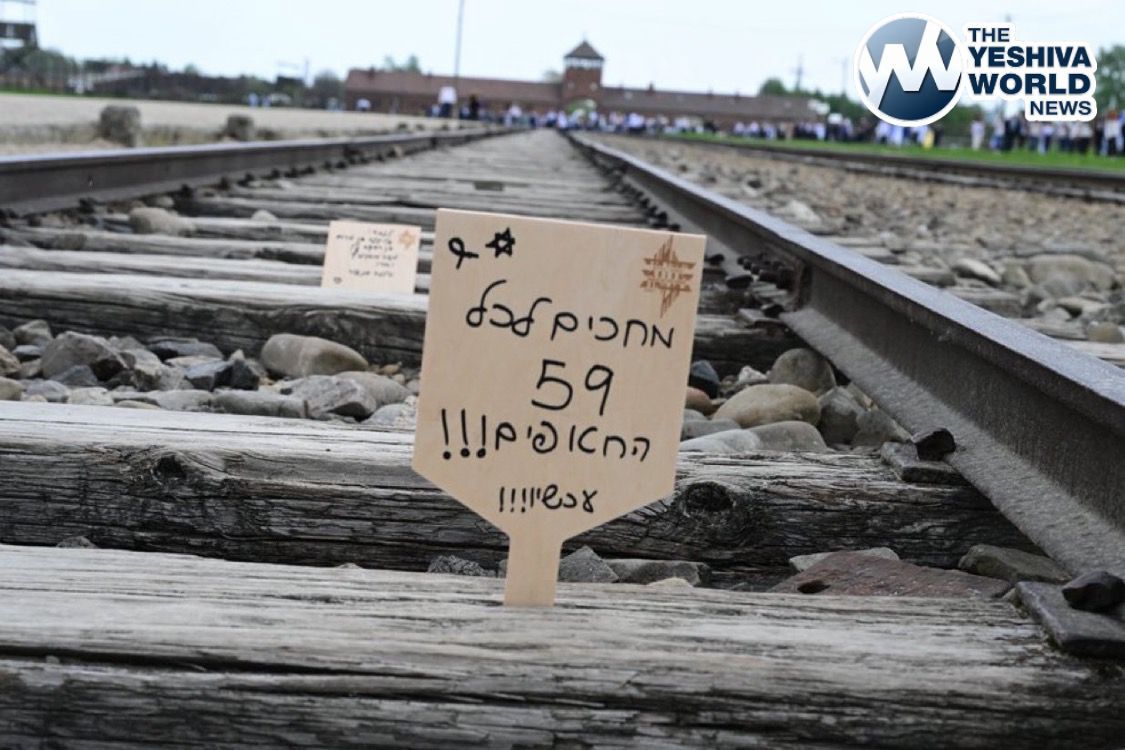 CHILLING: A call for the return of the 59 kidnapped people was placed on the train tracks leading into Auschwitz.