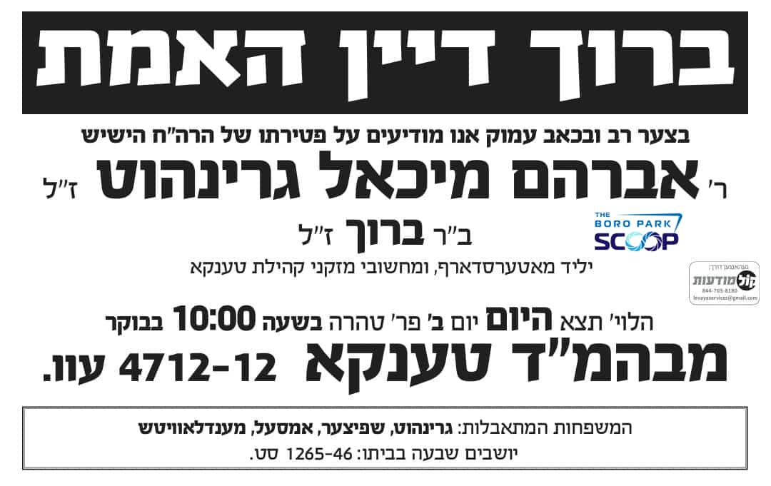 The Levaya will take place Monday at 10AM at the Tenka Shul at 4712 12th Avenue.