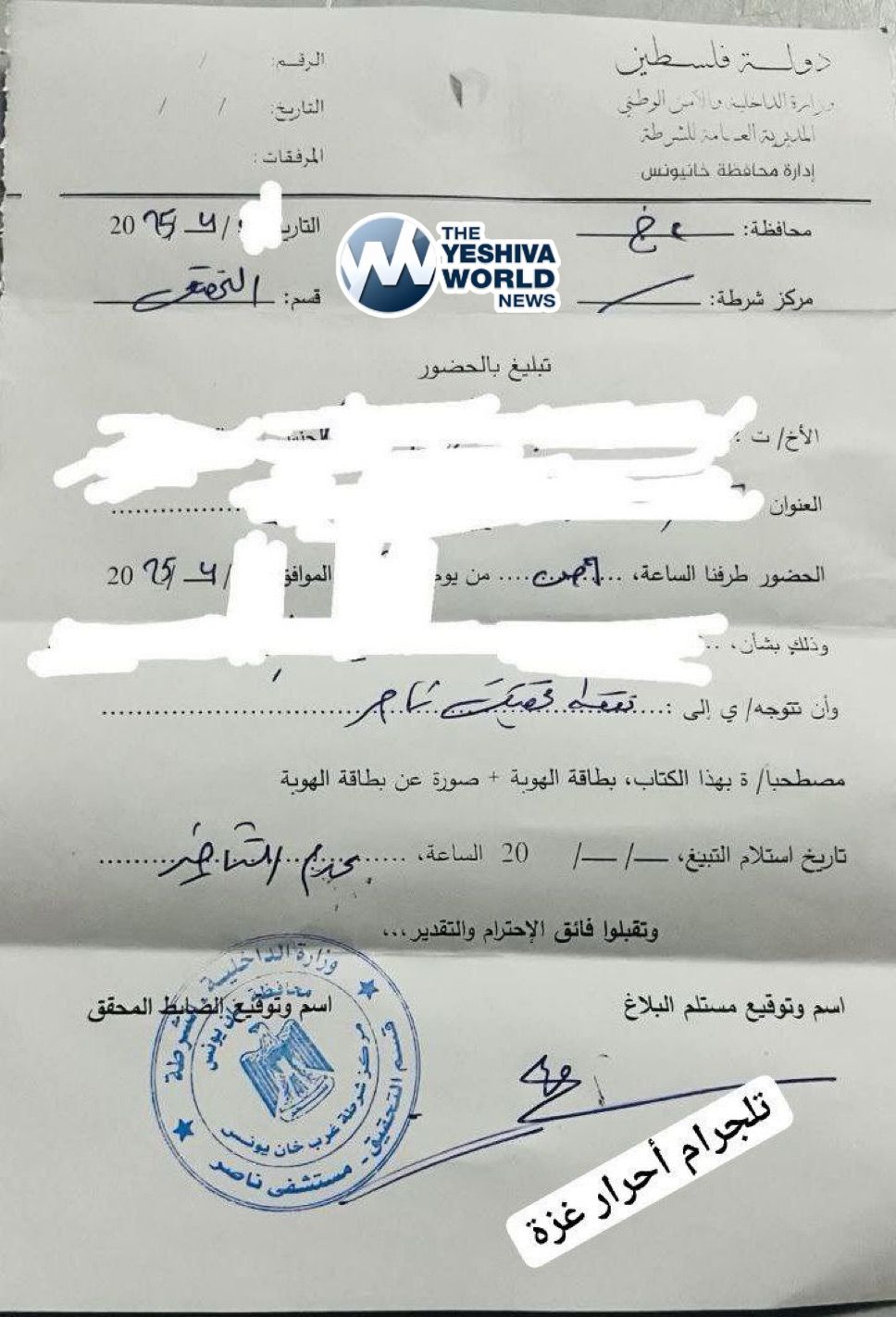 Hamas continues to use hospitals in Gaza as headquarters. This is an interrogation notice issued to a Gazan by Hamas internal security, summoning him to a room located in the Nasser hospital in Khan Younis.