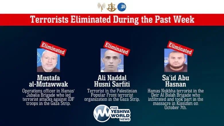 The IDF and Shin Bet eliminated three senior terrorists in Gaza, including Sa’id Abu Hasnan, who led the October 7 Kissufim massacre, and Ali Naddal Husni Sarfiti, a PFLP member and former prisoner jailed for planning a suicide bombing, the IDF announced Tuesday.