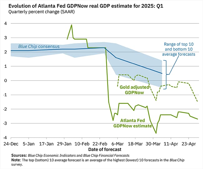 The Atlanta Fed now thinks the U.S. economy shrank more than expected at the start of 2025 — down 2.7%. After adjusting for gold imports and exports, it’s more like a 1.5% drop. If this continues next quarter, it could mean the U.S. is heading into a recession.