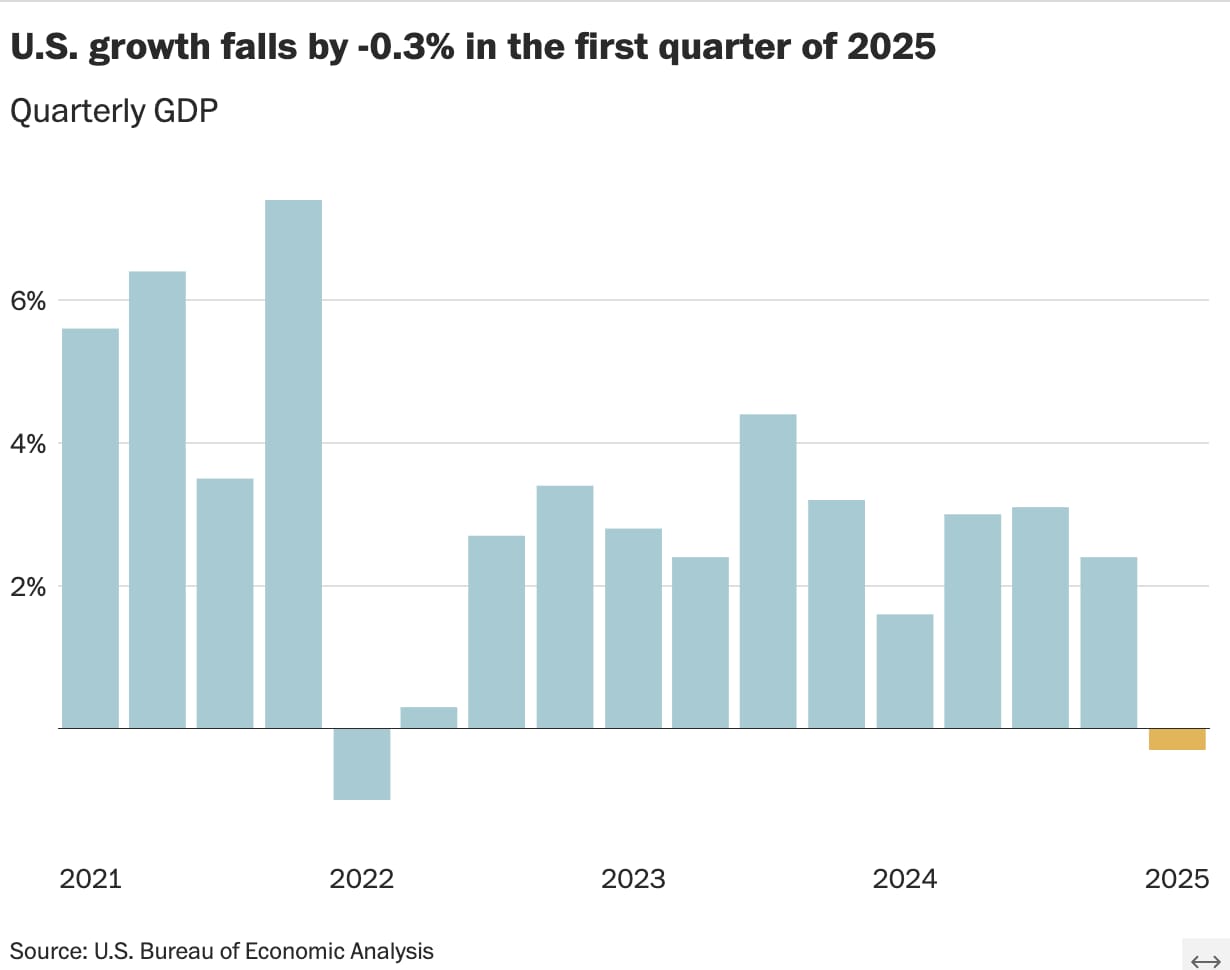 The U.S. economy shrank at the start of Trump’s second term, with GDP declining at a 0.3% annualized rate over three months ending in March.