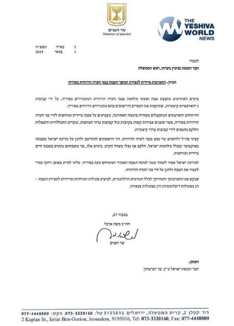 Israel’s Interior Minister Arbel urgently calls on Netanyahu to intervene and stop the massacre of Druze in Syria.