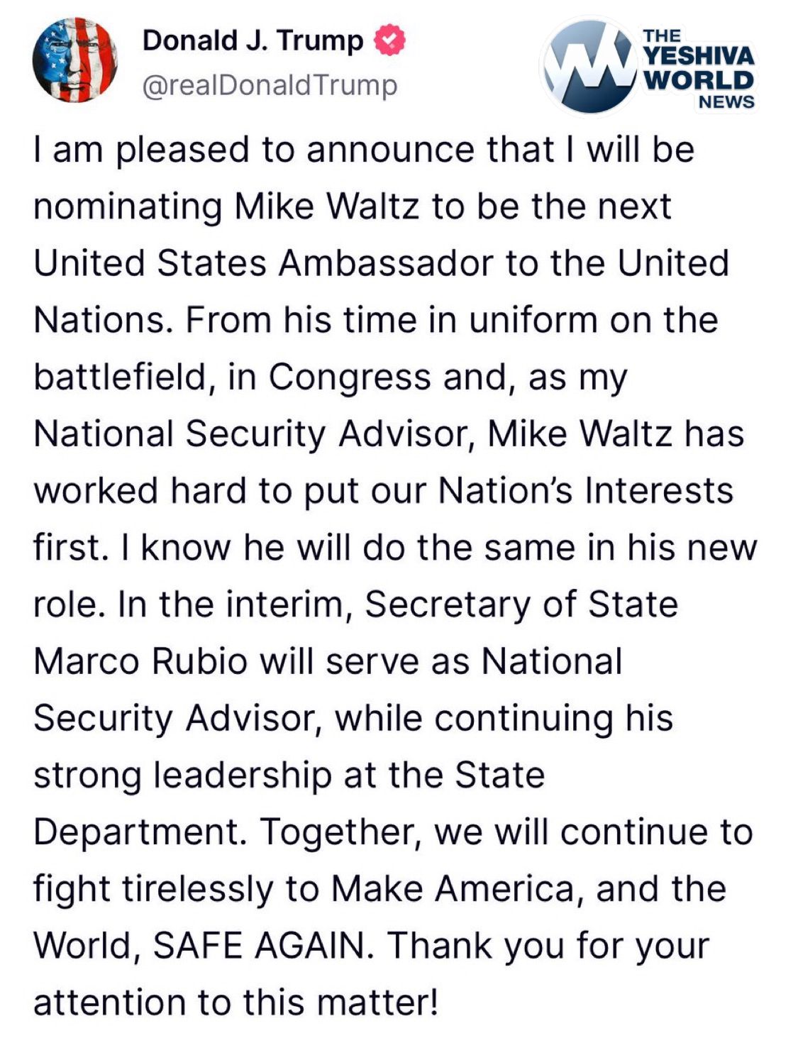 PLOT TWIST! President Trump announces that Mike Waltz will be the U.S. Ambassador to the United Nations.