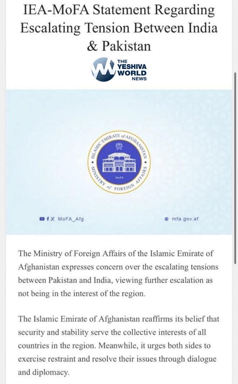 The Taliban have issued a statement calling on India and Pakistan to show restraint and start dialogue amid rising India-Pakistan tensions.