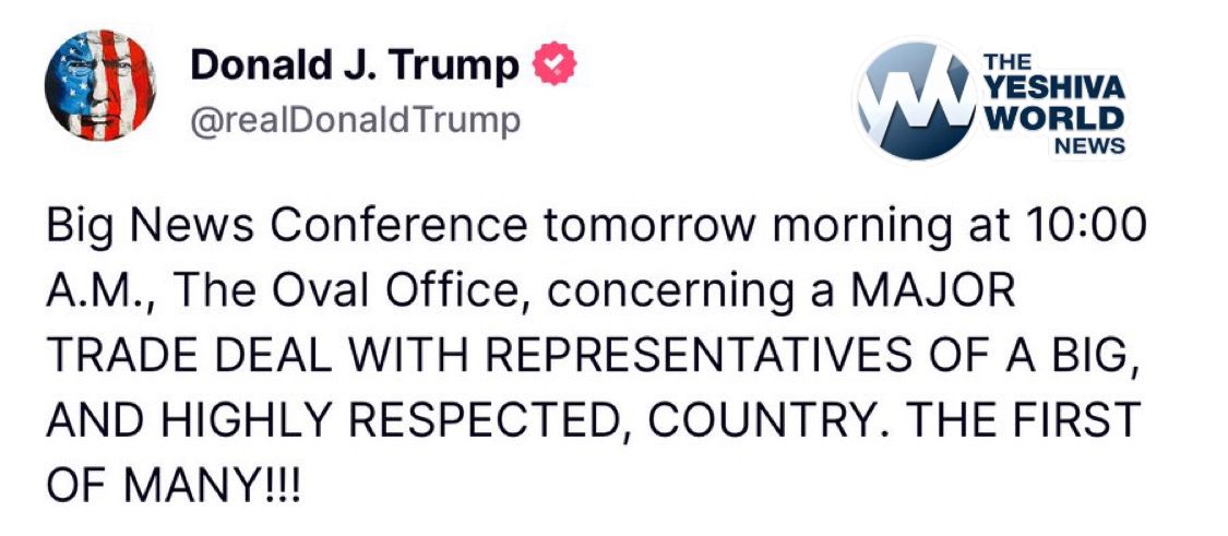 President Trump announces a big news conference tomorrow morning regarding a “MAJOR TRADE DEAL.”