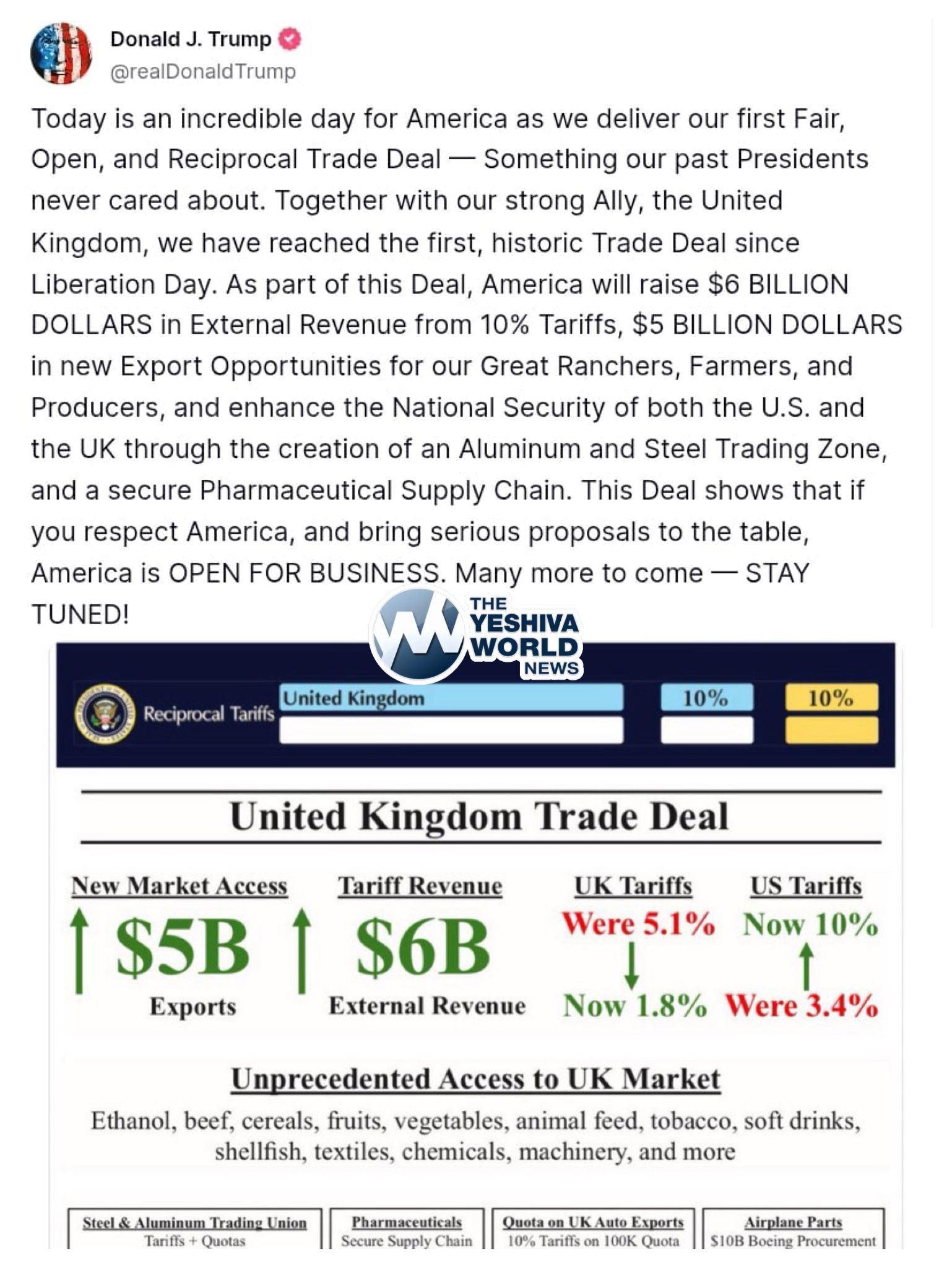 Trump says the deal with the UK will bring in $6 billion in tariff revenue, unlock $5 billion in new export opportunities for American farmers and producers, and strengthen national security through a joint Aluminum & Steel Trading Zone and a secure pharmaceutical supply chain. “America is OPEN FOR BUSINESS!” Trump declared.