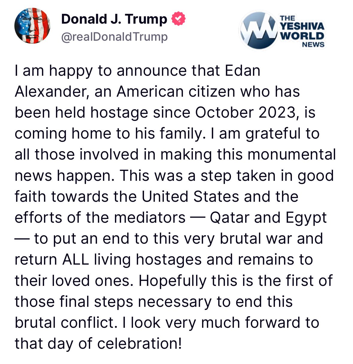 President Trump releases statement on the hopeful release of Edan Alexander.