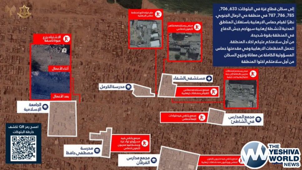 The IDF has issued an evacuation warning for Palestinians in several schools and a hospital in Gaza City’s Rimal neighborhood, saying that Hamas is exploiting the civilian sites for terror.