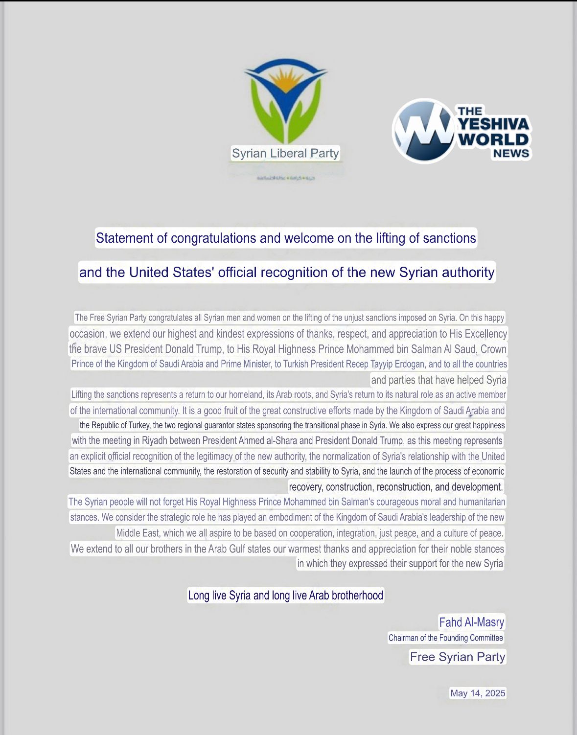 The Free Syrian Party welcomed today’s meeting between U.S. President Trump and Syrian President Al-Sharaa in Riyadh, saying it “represents an explicit official recognition of the legitimacy of the new government and the normalization of Syria’s relationship with the United States and the international community.”