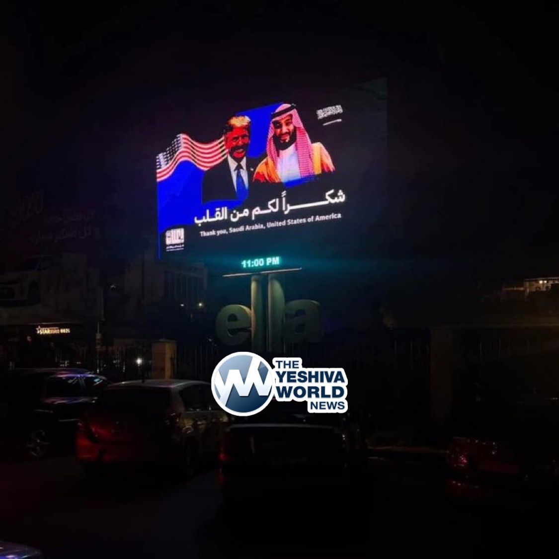 A billboard seen tonight in the Syrian capital of Damascus, featuring U.S. President Donald J. Trump and Saudi Crown Prince Mohammed bin Salman with the words, “Thank you from the heart” in Arabic and “Thank you, Saudi Arabia, United States of American” in English.