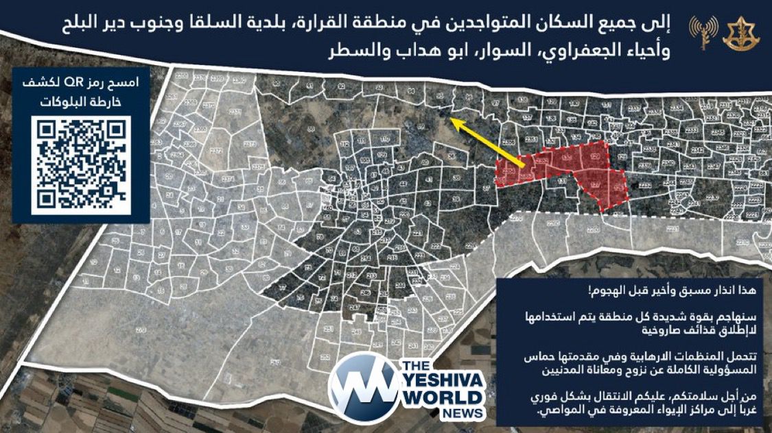 Following rocket fire from the central Gaza Strip at the Kissufim area near the border, the IDF issues a final evacuation warning for Palestinians in the Khan Younis suburb of Al-Qarara and the south Deir al-Balah area.