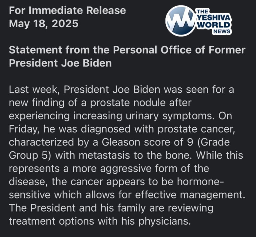 🚨 BREAKING: President Joe Biden has been diagnosed with prostate cancer with metastasis to the bone.