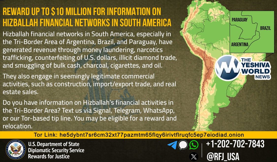 The U.S. is offering up to $10 million for information on Hezbollah’s financial networks in South America, where the Iran-backed terror group, responsible for multiple attacks, generates significant revenue from drug trafficking, forgery, counterfeiting, smuggling, and other illicit and legitimate activities.
