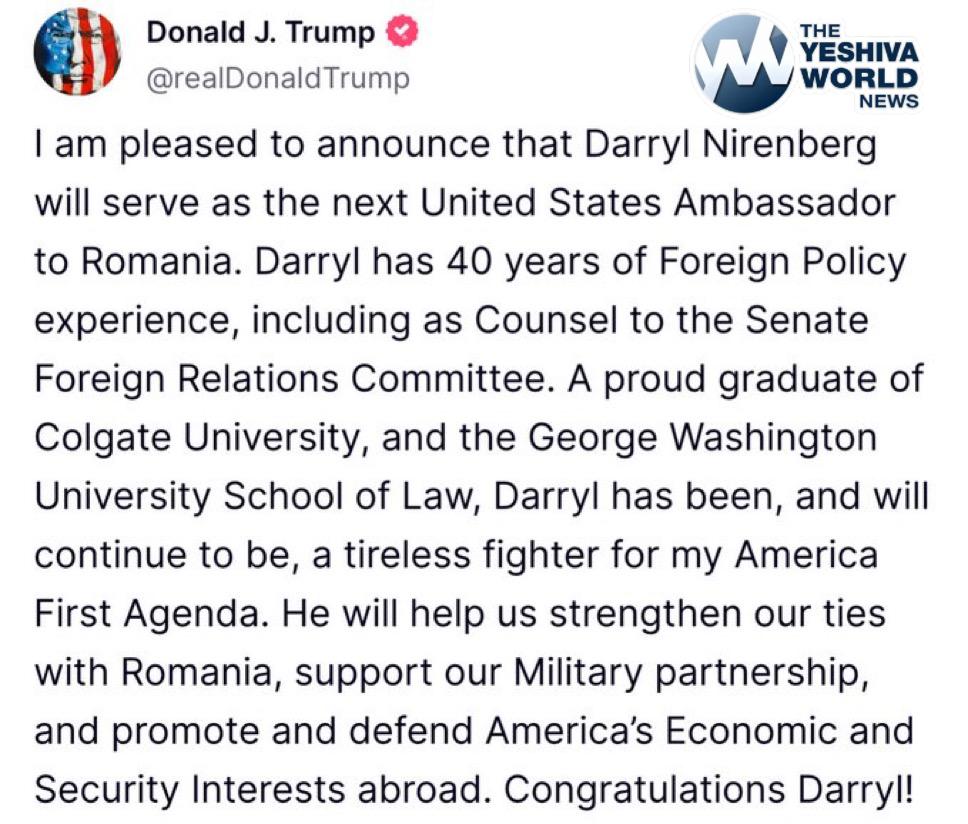 President Trump announces that Darryl Nirenberg will be the next Ambassador to Romania.