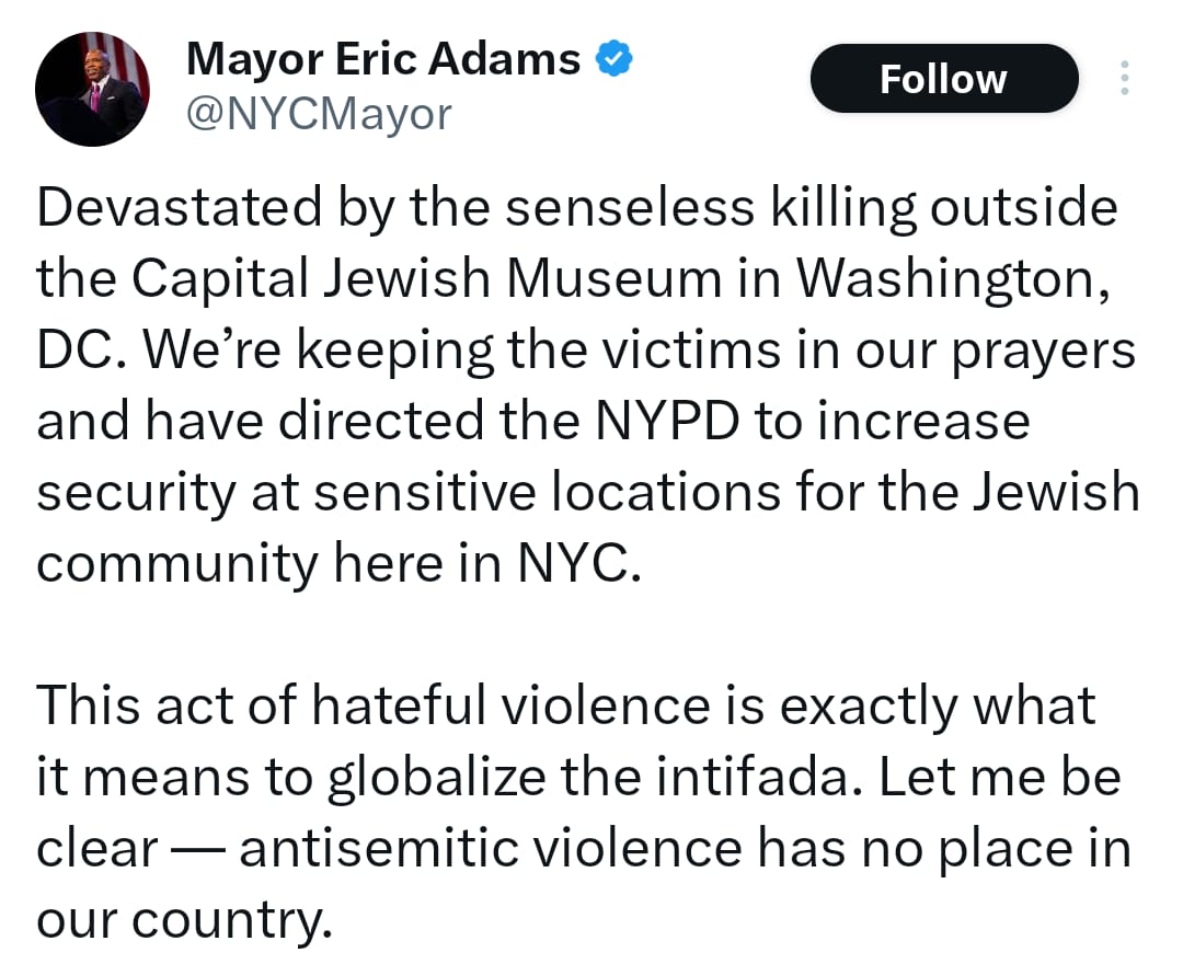 In response to tonight’s terrorist shooting in Washington, DC, NYC Mayor Eric Adams has directed the NYPD to bolster security at Jewish sites across New York City.