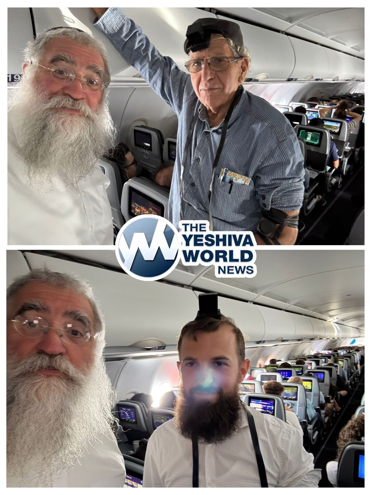 Rabbi Yitzchok Minkowicz, director of Chabad of Southwest Florida, seen putting tefillin on Jews aboard a packed JetBlue flight from Florida to New York.
