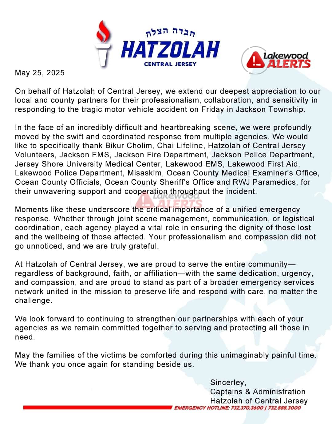 Hatzolah of Central Jersey releases a statement thanking its partners for their efforts during and after Friday’s horrific car crash that killed three bochurim and critically injured a fourth.