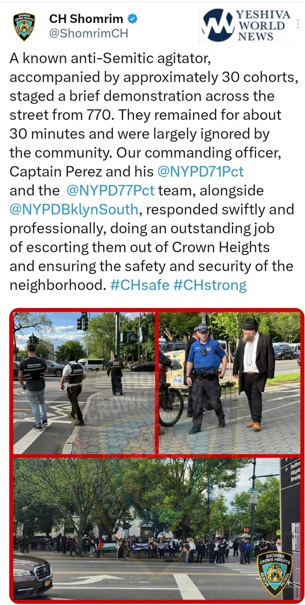 Update From Crown Heights Shomrim On Free Palestine Protest Near 770