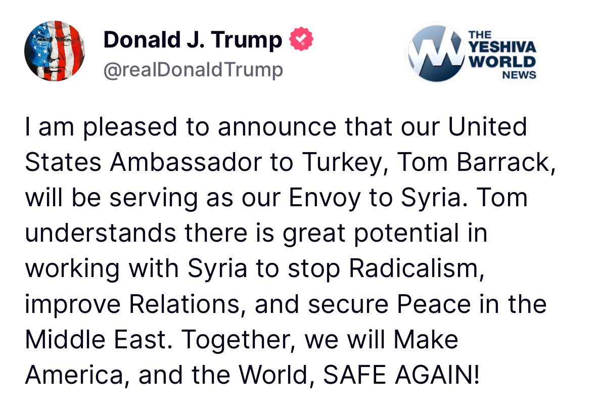 President Trump taps already State Ambassador to Turkey, Tom Barrack, to serve as Envoy to Syria.