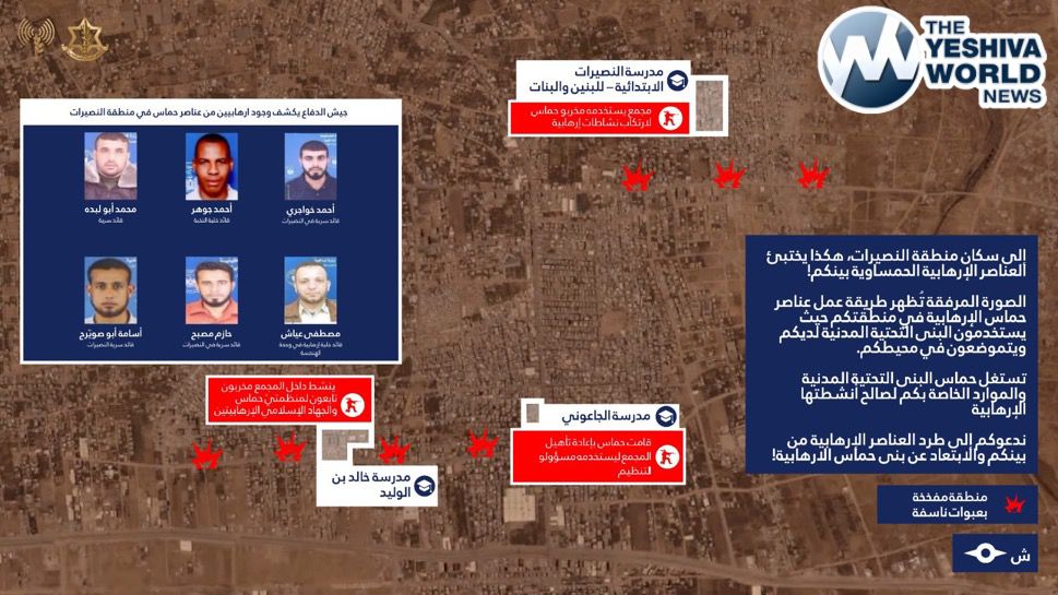 The IDF issues an unusual warning to Palestinians in the Nuseirat area of central Gaza, telling them to stay away from several locations where the military claims Hamas operatives are. The IDF also names six prominent Hamas operatives in its announcement.
