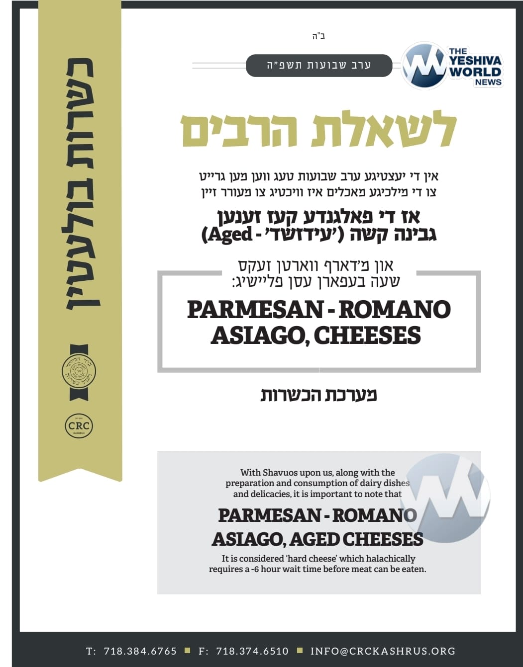The Central Rabbinical Congress (CRC) has issued a notice regarding the consumption of Parmesan, Romano, and Asiago cheeses, particularly aged varieties. According to the CRC, these cheeses are classified as “hard cheese” under halachic guidelines, requiring a 6 hour waiting period before meat can be consumed.