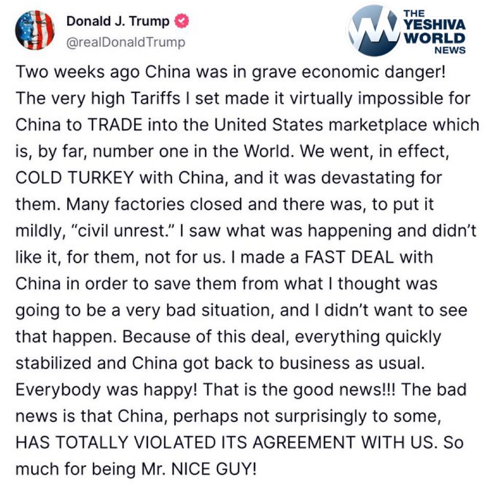 President Donald Trump says China has “totally violated its agreement with us,” in regards to the tariff war.