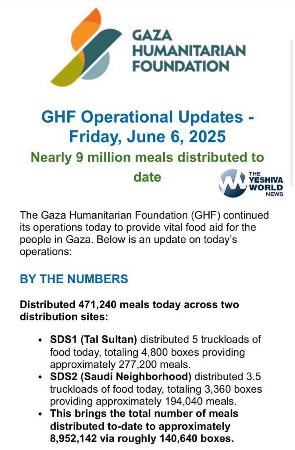 GHF says it distributed nearly half a million meals today across two distribution sites in Rafah.