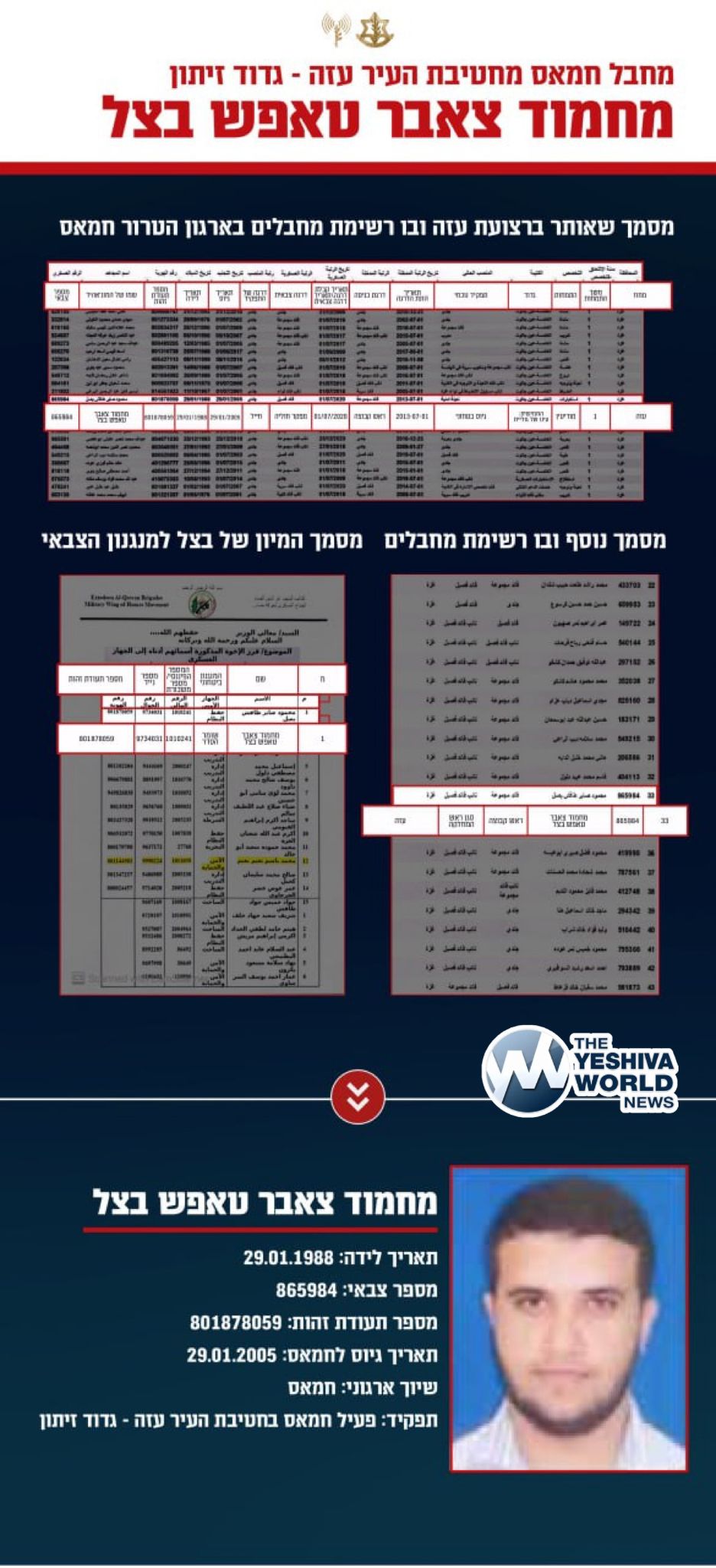The IDF publishes intelligence documents captured during operations in Gaza which it says prove that the spokesperson for the Civil Defense Agency in the Strip is an “active terrorist” in Hamas.