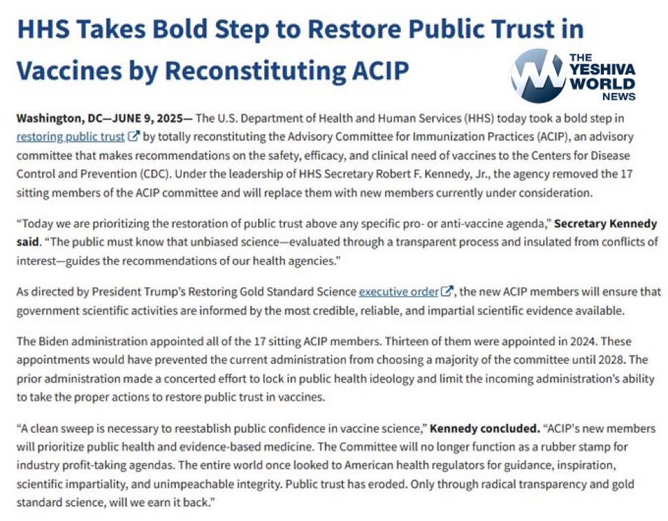 HHS Secretary RFK Jr. has disbanded the entire CDC vaccine advisory committee, saying: “A clean sweep is necessary to reestablish public confidence in vaccine science.”