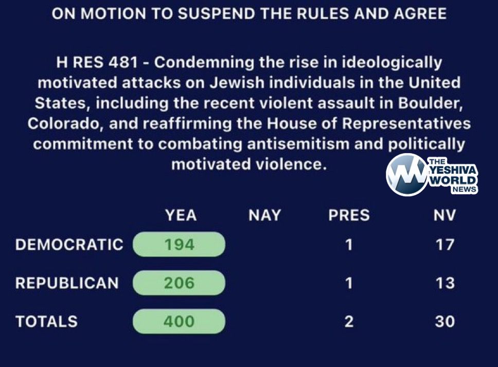 US House of Representatives votes 400-0-2 to condemn the recent rise in antisemitic violence in the United States. The two who didn’t vote in favor, Rashida Tlaib and Marjorie Taylor Green.