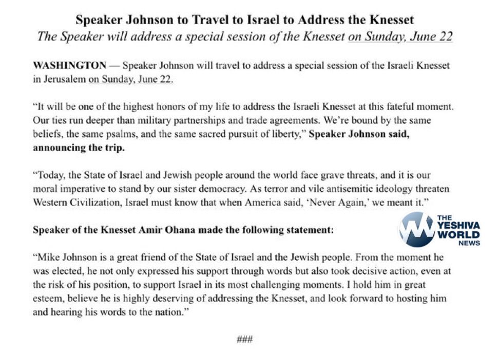 Speaker Mike Johnson will address a special session of the Israeli Knesset on June 22 at the invitation of Knesset Speaker Amir Ohana.