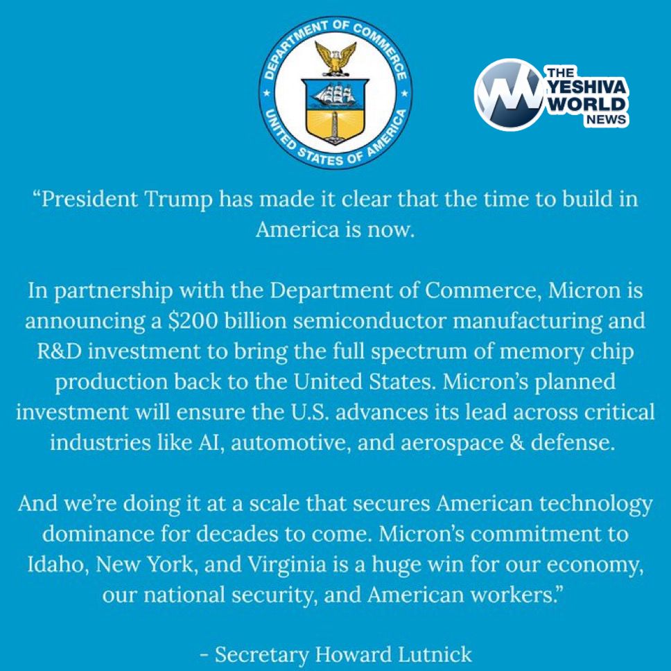 President Trump has secured a $200B Investment from Micron Technology for Memory Chip Manufacturing in the United States.