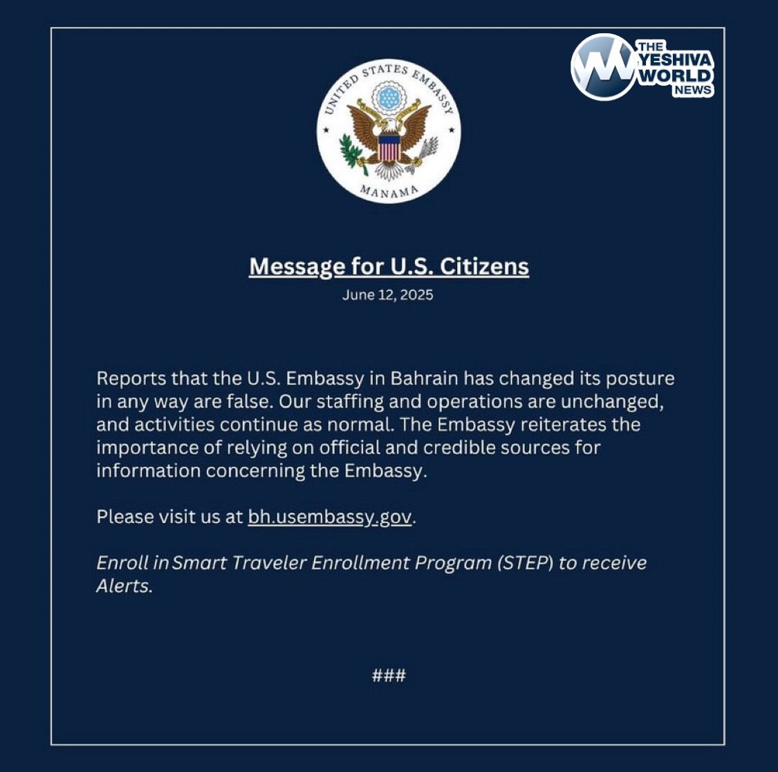 The U.S. Embassy in Bahrain has released a statement denying any change in their posture related to tensions in the region with Iran, adding that staffing and operations are unchanged and activities continue as normal.