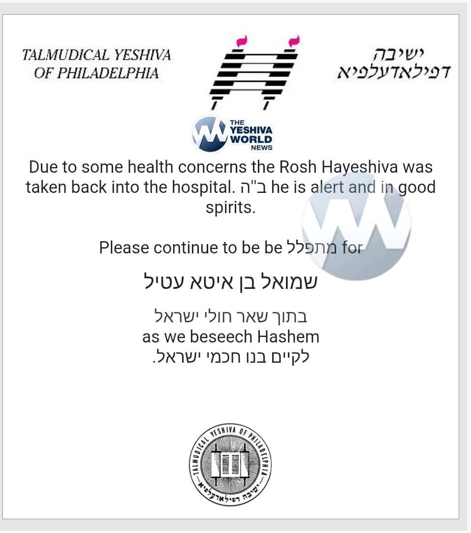 ๐จ TEHILLIM: The Zkan Rosh Yeshiva, Hagaon Harav Shmuel Kamenetzky, has been taken back into the hospital due to some health concerns. ื”ื he is alert and in good spirits. Please continue to be be ืืชืคืื for ืฉืืืื ืื ืืืื ืขืืื.