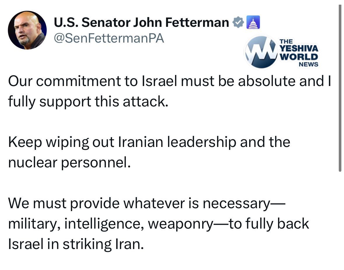 Sen. John Fetterman releases a statement on X nodding in approval of the IDF’s widespread airstrikes in Iran tonight that have reportedly wiped out Iran’s top military leadership.