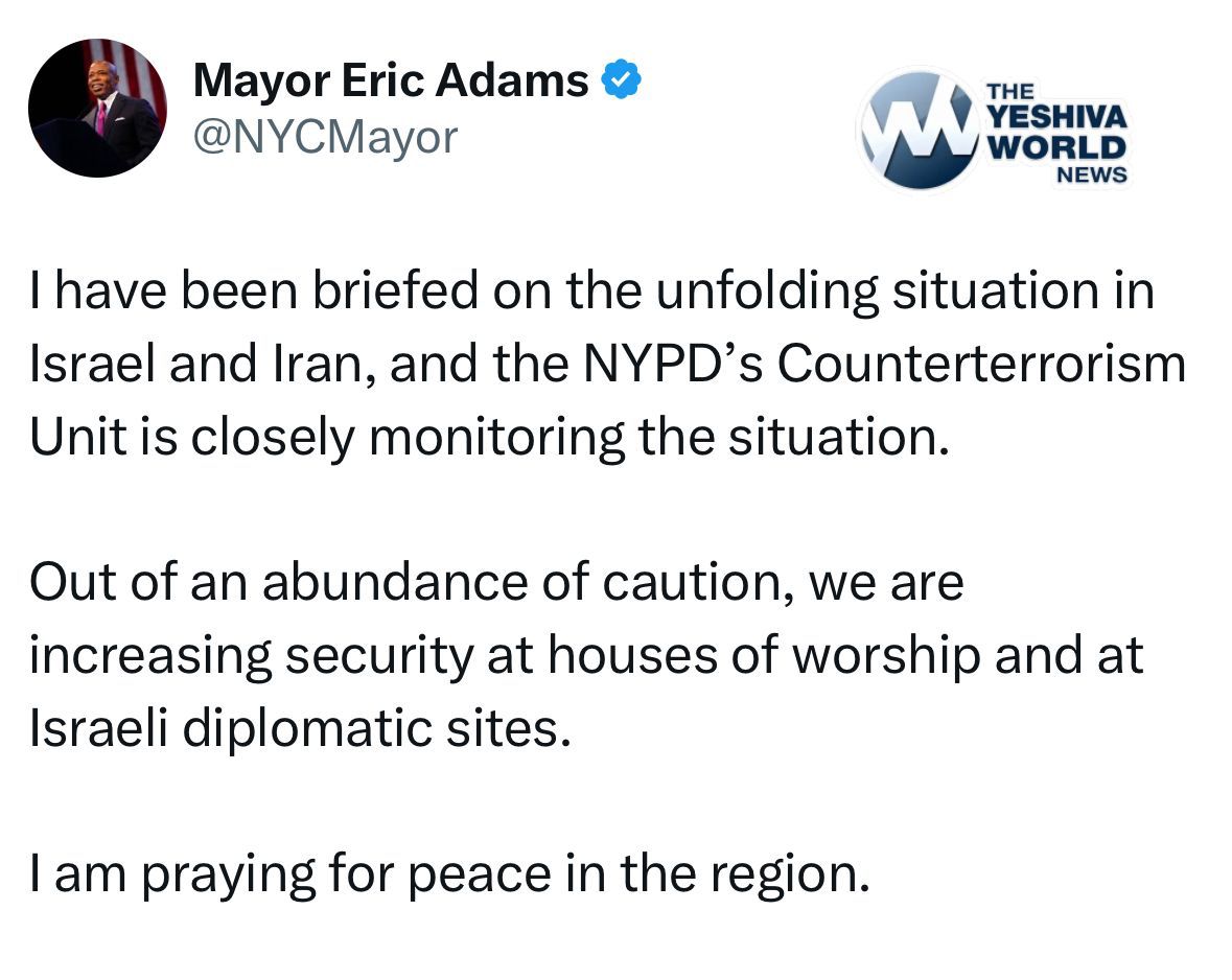 New York Mayor Eric Adams confirms that he is being briefed on the unfolding Israel vs. Iran situation, and is deploying resources to protect Jewish and Israeli sites