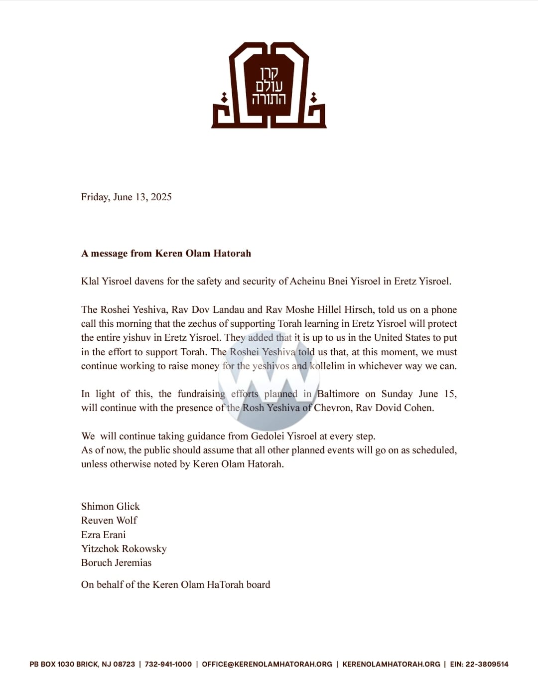 Update From Keren Olam Hatorah In Light Of The Security Situation In Eretz Yisroel