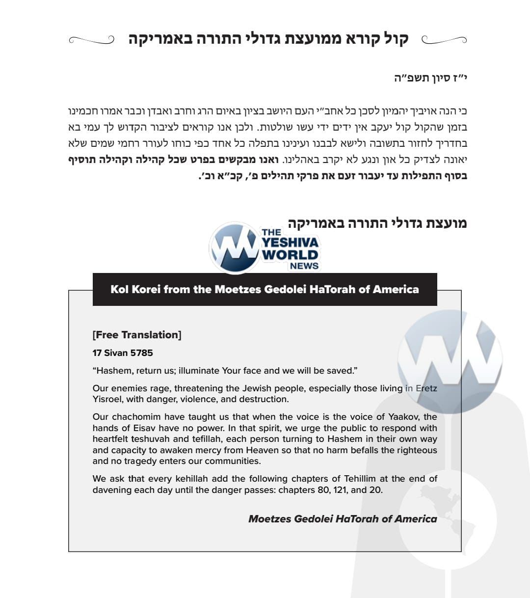 Timely Kol Korei From the Moetzes Gedolei HaTorah of America