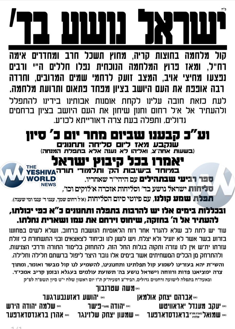 The Eida HaChareidis has released a statement that tomorrow, yeshiva and cheder students will recite the fourth book of Tehillim due to the war with Iran.