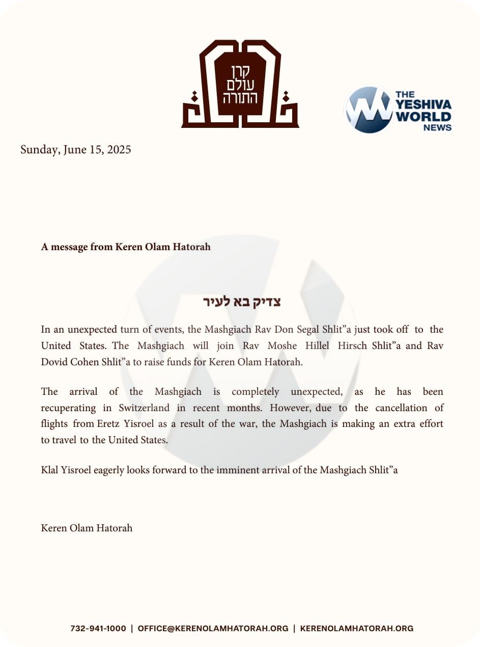 Harav Don Segal shlit”a is heading to the United States to assist Keren Olam Hatorah’s fundraising efforts, amid uncertainty about the ability of Gedolei Eretz Yisroel to come due to the ongoing security situation.