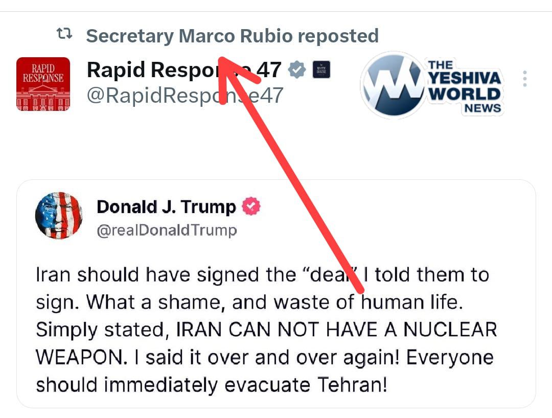 🚨🚨🚨 IS THE UNITED STATES ABOUT TO ATTACK IRAN? U.S Secretary of State Marco Rubio, as well as other admin officials and accounts, are reposting the statement earlier by President Trump, which called to immediate evacuate Tehran.