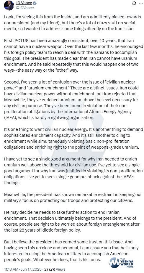 BREAKING: Vice President JD Vance says Trump could take ‘additional action’ against Iran’s nuclear program.