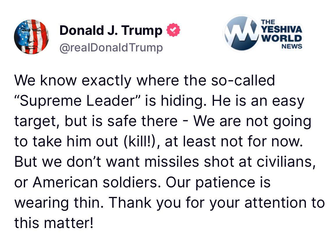 🚨🚨 BREAKING: Trump says ‘We know exactly where the so-called “Supreme Leader” is hiding. He is an easy target, but is safe there – We are not going to take him out (kill!), at least not for now. But we don’t want missiles shot at civilians, or American soldiers. Our patience is wearing thin. Thank you for your attention to this matter!’